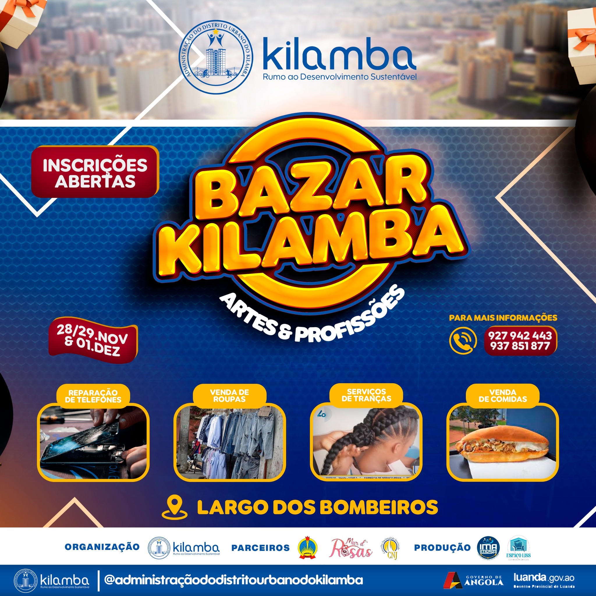 Nos próximos dias 28 e 29 de Novembro, a Centralidade do Kilamba vai acolher o Bazar Kilamba Artes e Profissões, um evento que promete reunir talentos e profissões diversas em um ambiente de integração e confraternização. Organizado pela Administração do Distrito Urbano do Kilamba e realizado pelo Espaço Liss em parceria com o projecto comunitário IMA IMOSHI, o bazar tem como principal objetivo promover a interação entre as artes e as profissões, oferecendo aos expositores uma plataforma para mostrar os seus talentos, além de impulsionar as atividades económicas da região.